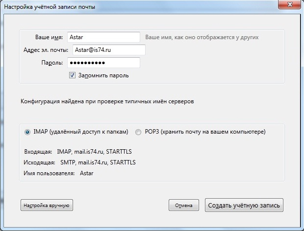5. Выберите пункт «IMAP (удаленный доступ к папкам)», и нажмите кнопку «Создать учетную запись».
