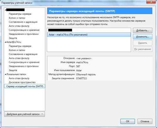 7. В открывшемся окне, в его правой нижней части, выберите пункт «Сервер исходящей почты (SMTP)». В появившемся меню справа, выберите вашу учетную запись, и нажмите кнопку «Изменить».