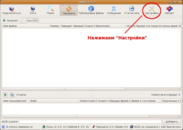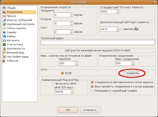 6. В пункте «Настройки» снимаем галку с типа сети «Kademlia», остальные настройки оставляем по умолчанию.