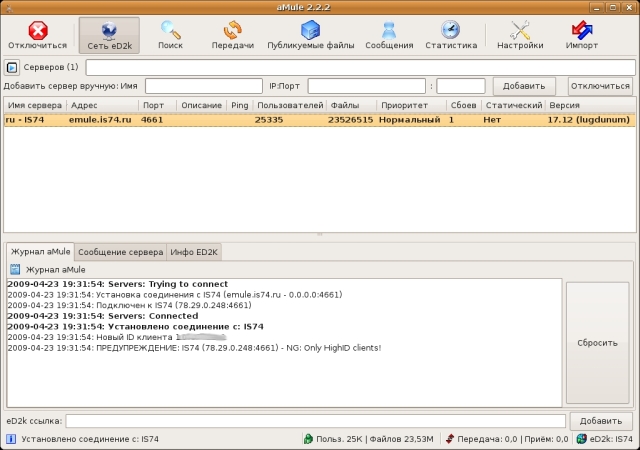 12. После совершения п.10 программа в «Журнале» напишет «Сервер добавлен: сервер [emule.is74.ru:4661] использует имя «ваше введенное имя».