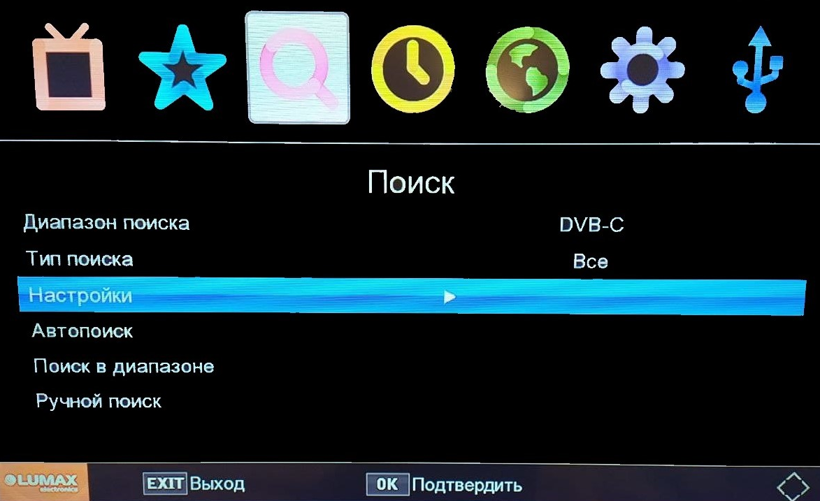 Модуляция: 256QAM (выбор значения производится кнопкой «<» или «>»)