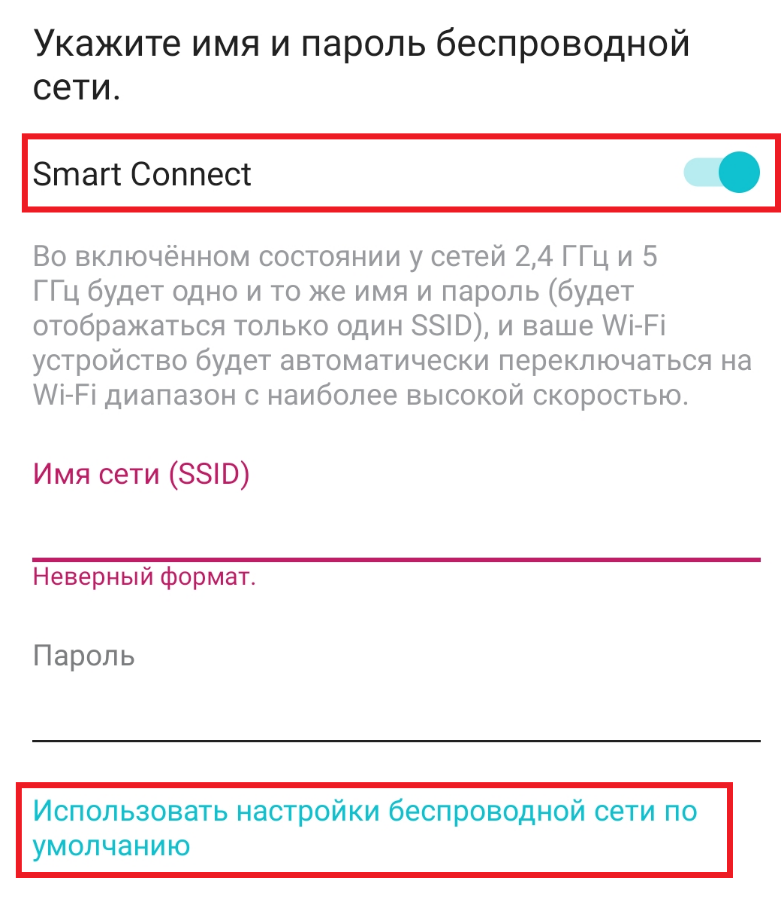 9. Отключите функцию "Smart Connect" и задайте сети имя с паролем. Если не хотите придумывать, нажмите "Использовать настройки беспроводной сети по умолчанию".